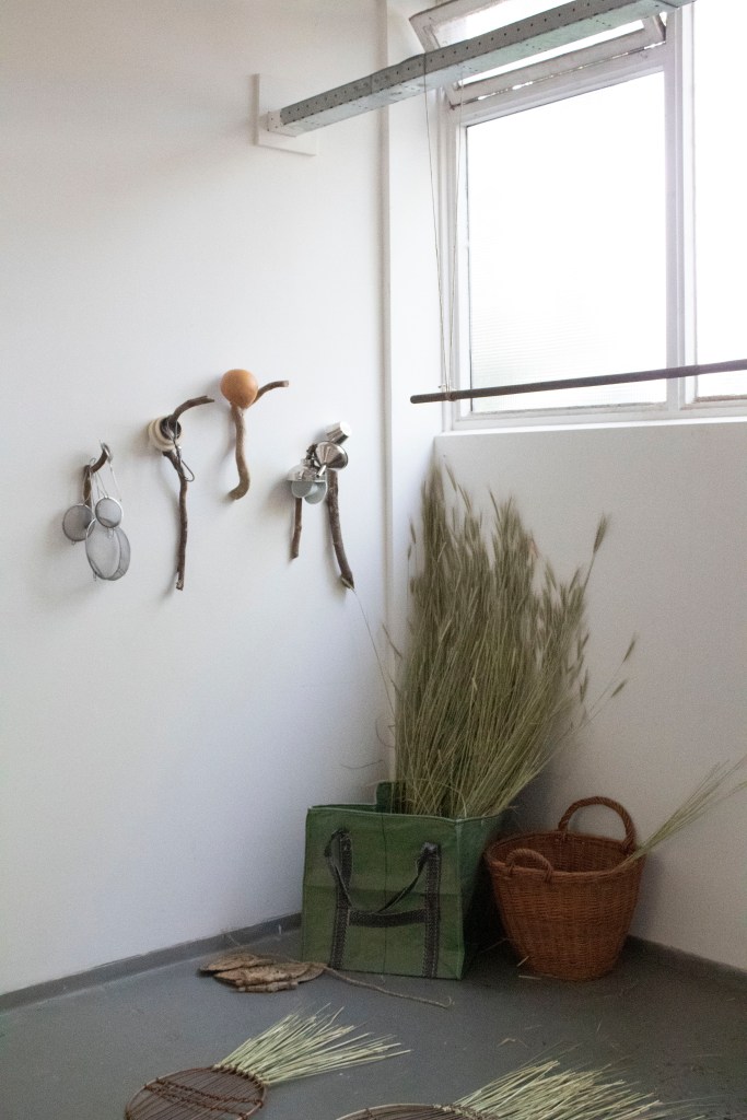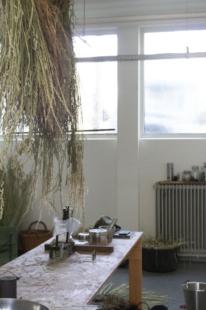 Through the clay walls and tall grasses, Suzanne walks ahead of me, looking for some useful items for her studio. Along the way, she tells me all about the different types of grains and grasses. We stumble upon a meadow full of grain. The wind blowing through it lets us hear the fine, light sound of the grass rustling against each other. A unique place, squatting in the grain, looking at all the blades growing past each other, tangled together.